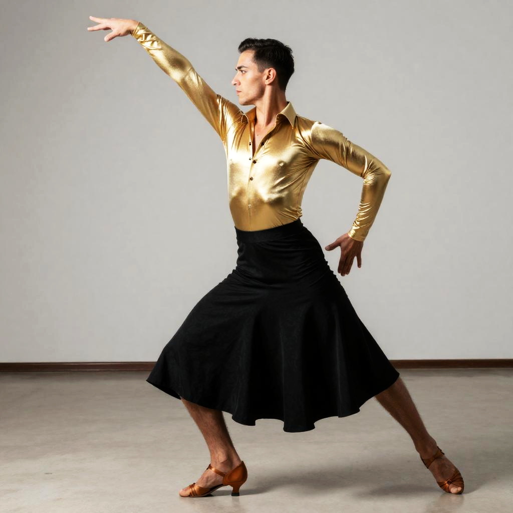 Peekaboo Color hairstyle on male dancer, wearing fitted black turtleneck and trousers, in contemporary dance studio, captured in fashion editorial style with soft diffused spotlight.