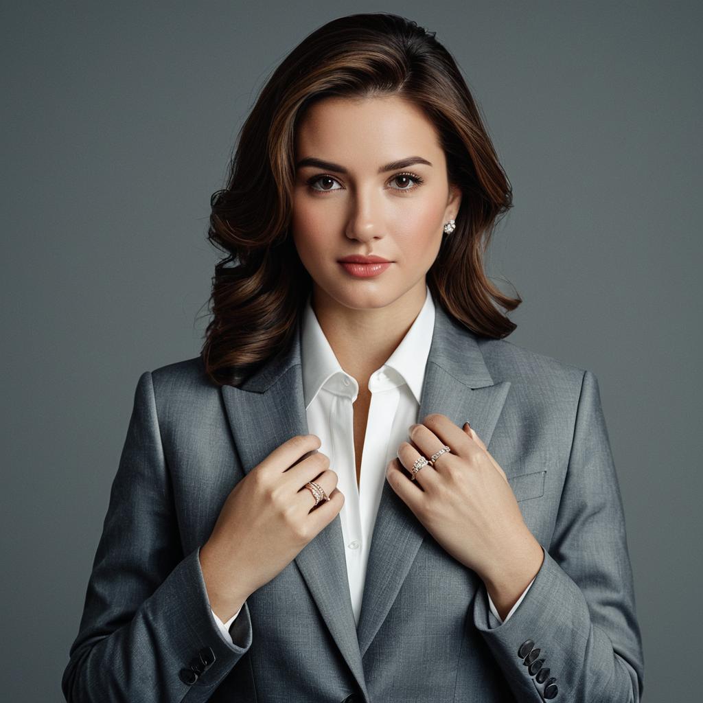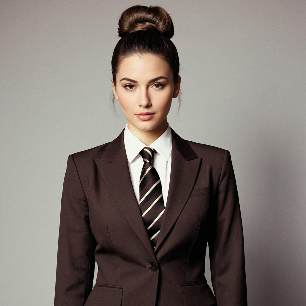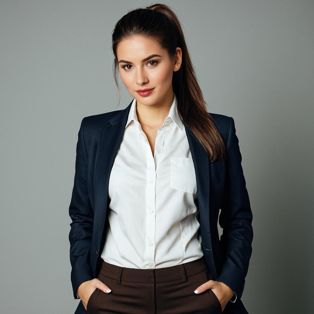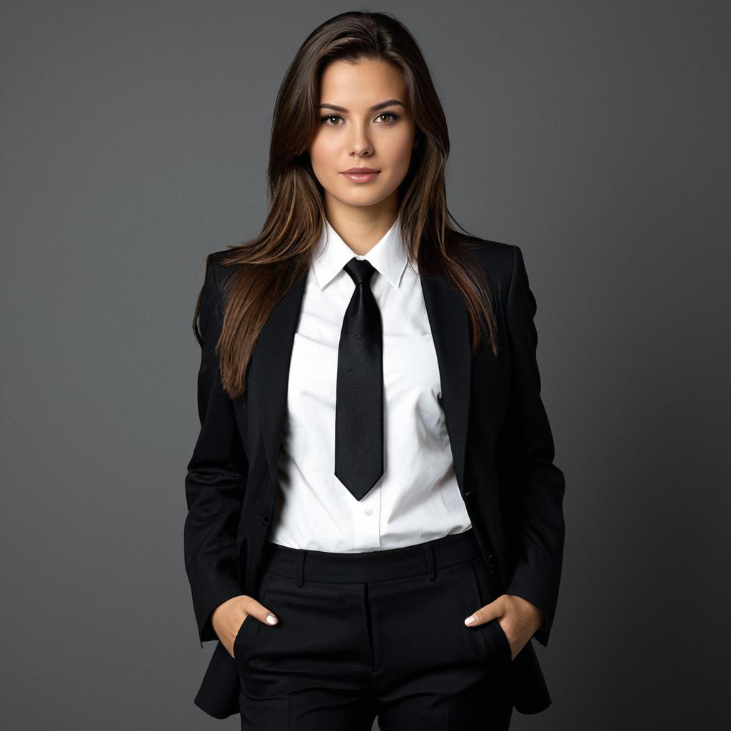 Female business suit,1girl, solo, necktie, brown hair, suit, formal, realistic, ponytail, hands in pockets, shirt, jacket, brown eyes, white shirt, grey background, pants, black necktie, looking at viewer, collared shirt, lips, closed mouth, long hair