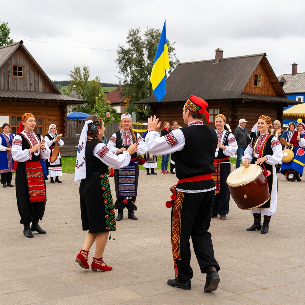 Ukraine cultural festival scene showcasing traditional folk dancers in colorful embroidered costumes, lively music and drums, ornate decorative patterns, set in a village square surrounded by rustic wooden cottages and fluttering embroidered flags.