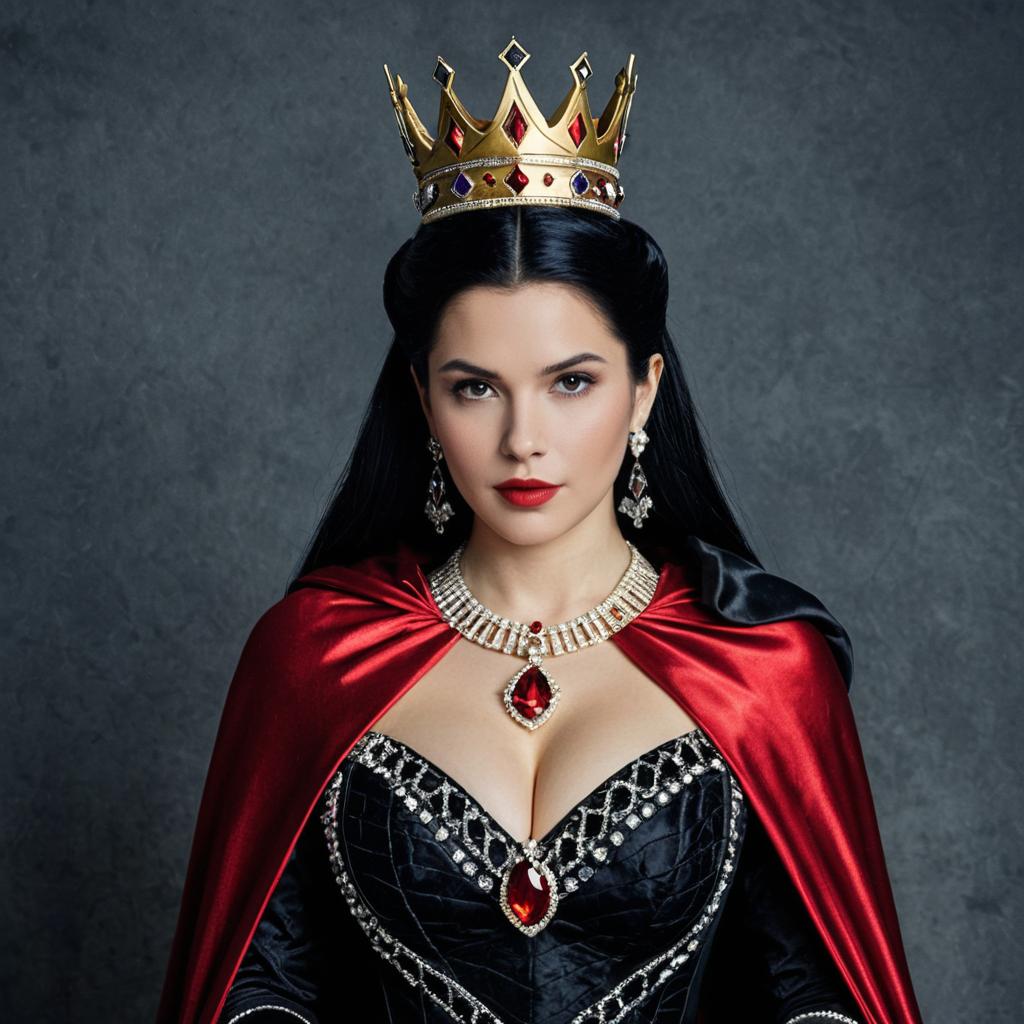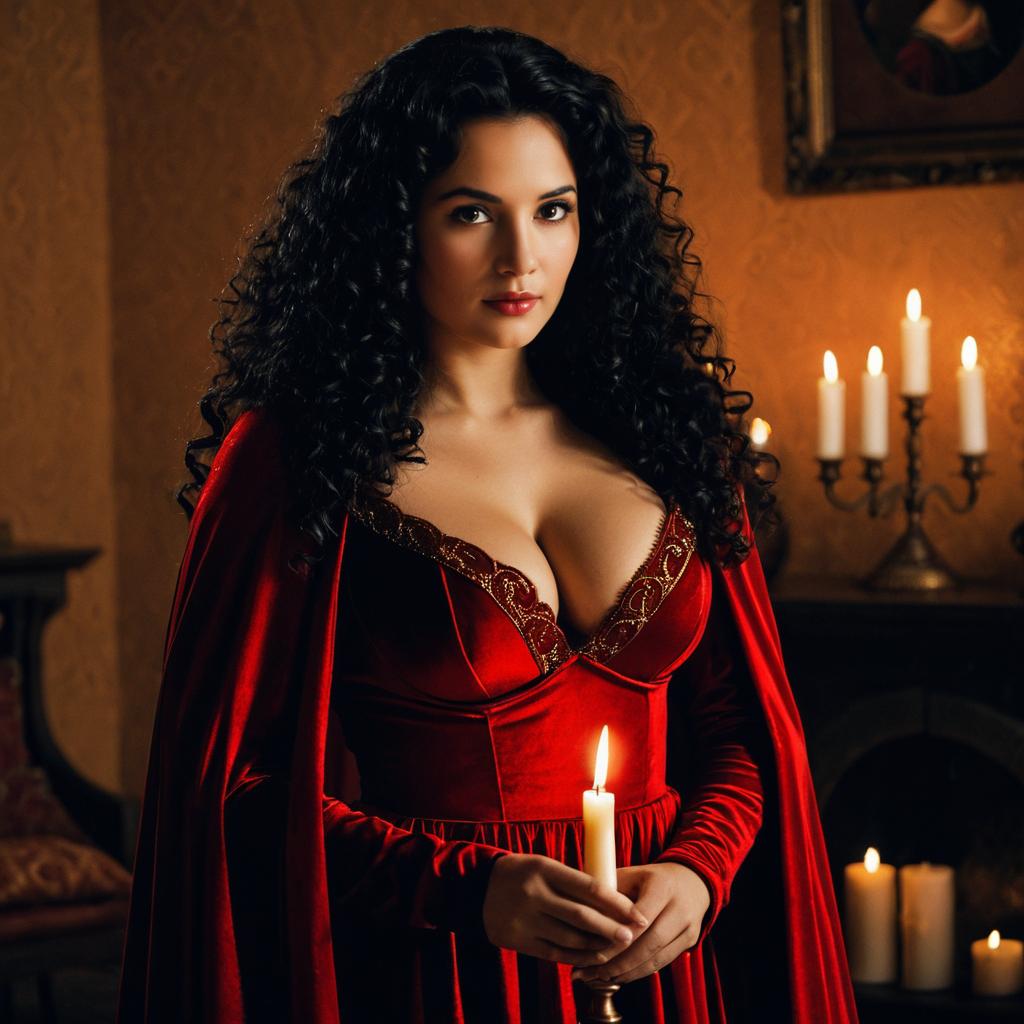 Portrait of a woman with long, curly black hair and brown eyes wearing a deep red velvet dress with a cape. She is standing indoors in a dimly lit room holding a lit candle. The dress features intricate gold embroidery along the neckline and long sleeves. The background includes multiple lit candles and ornate furniture, creating a warm, vintage atmosphere.
