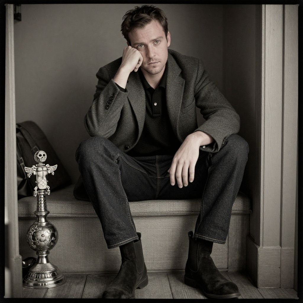 A man, charcoal gray blazer, black pique polo shirt, dark denim jeans, black suede Chelsea boots, silver cufflinks, cozy nook, soft lighting, vintage decor, calotype process, contemplative expression Man has masculine face and piercing eyes