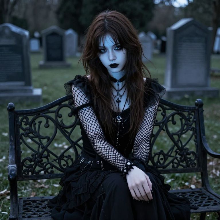 Brown hair goth sitting on ornate wrought iron bench in a moonlit cemetery, wearing layered black clothing with fishnet sleeves, intricate accessories, soft blue light illuminating her face, melancholic tone