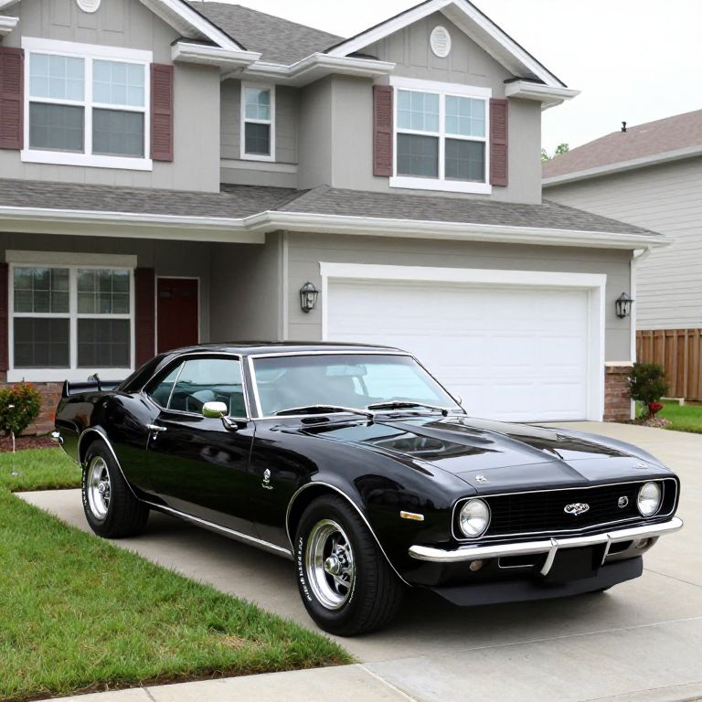 Shiny black 1967 Chevrolet Camaro parked in front of a two-story suburban home with a white garage door and neatly trimmed green lawn.