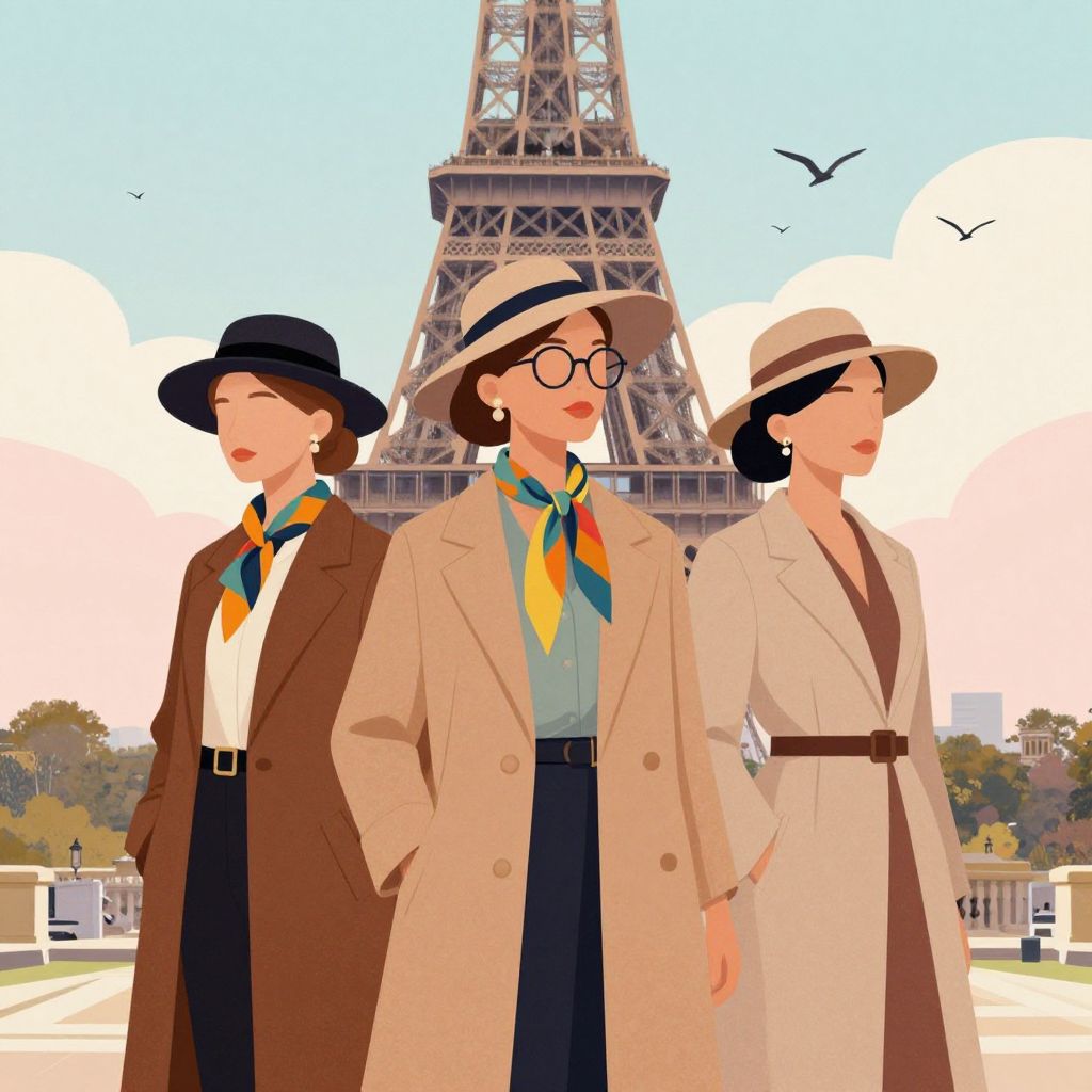 In this captivating illustration, three elegantly dressed women stand confidently in front of the iconic Eiffel Tower, creating a striking juxtaposition of modern fashion and timeless architecture. The woman in the center, adorned with a stylish hat and a vibrant scarf, exudes sophistication with her chic coat and glasses. To her left, another woman in a brown coat and hat, complemented by a colorful scarf, adds a touch of warmth to the scene. On the right, the third woman, wearing a beige coat and hat, completes the trio with a sense of effortless style. The background, a blend of soft pastel hues and intricate architectural details, enhances the overall composition, while the flying birds add a dynamic element to the serene atmosphere. The interplay of colors, textures, and shapes creates a harmonious balance, making this image a beautiful representation of Parisian elegance.