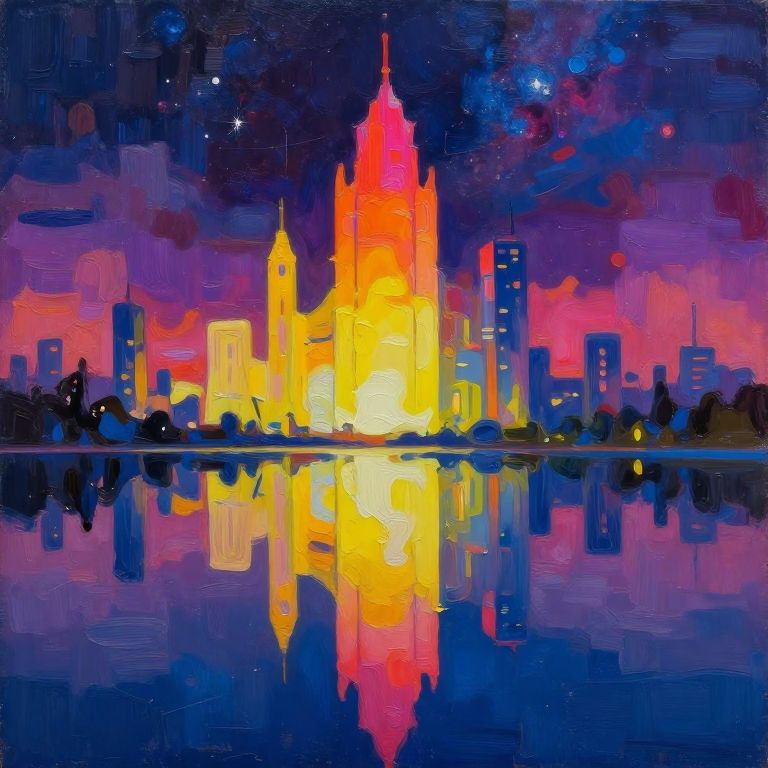 This digital painting features a vibrant cityscape at night, centered around a towering, brightly lit skyscraper in yellow and orange hues, reflecting in a calm, dark blue river below. Surrounding skyscrapers are illuminated in pink, red, and blue, creating a colorful, neon-lit skyline. The sky is a deep, dark blue with scattered stars and a few clouds, adding a cosmic feel. The city buildings vary in shape and height, with some resembling modern, sleek designs and others more traditional. The overall style is abstract with bold, vivid colors and a reflective, mirror-like quality in the water.