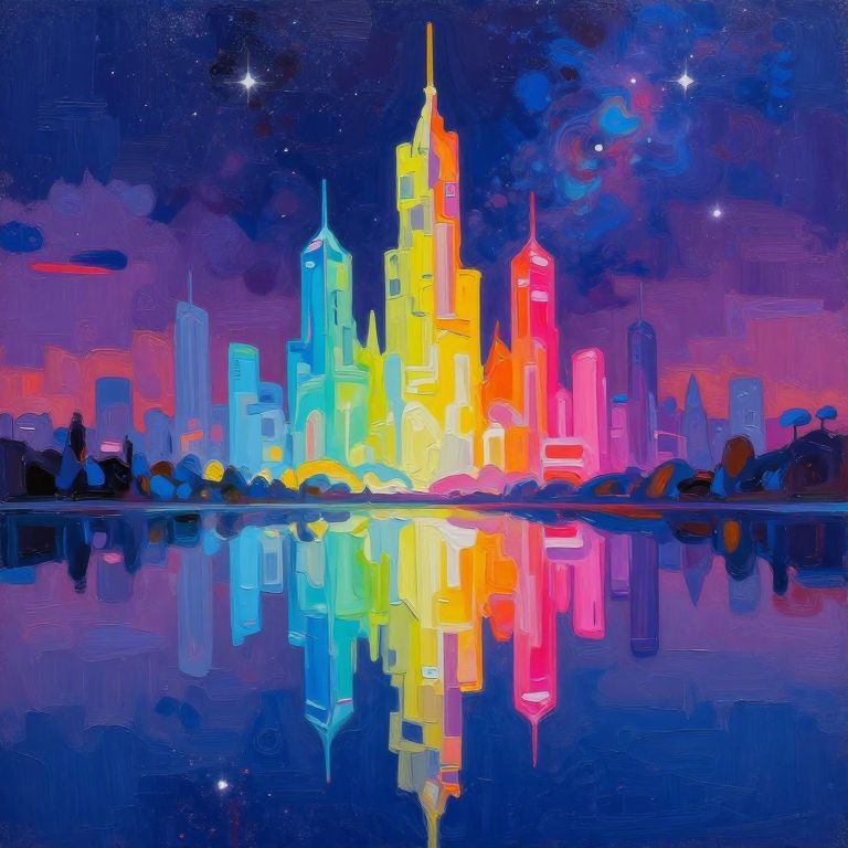 Abstract oil painting, gradient vibrant neon colour, rough, textural, broad brush strokes, a futuristic sci-fi city with tall, perfectly reflected in a tranquil, still lake, at night, surreal colours, detailed night sky with stars and nebulas