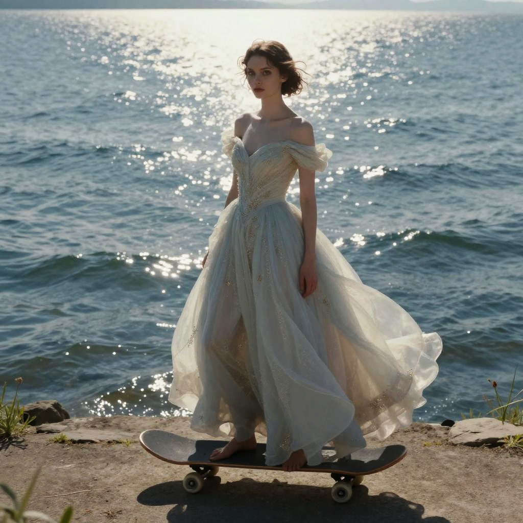 Realistic photo.Monika Beisner, surreal, mysterious, strange, fantastical, fantasy, sci-fi, Japanese anime, shimmering lake, skateboard, elegant gown, perfect voluminous body, detailed masterpiece. realistic photo
