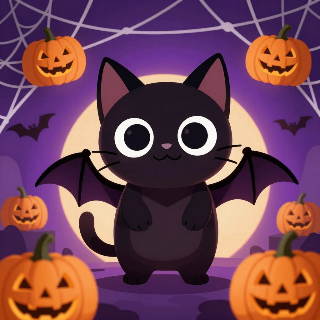 Scary cute cat with big round eyes, tiny bat wings and a mischievous smile, surrounded by floating pumpkins and cobwebs, vibrant Halloween theme, cartoon style