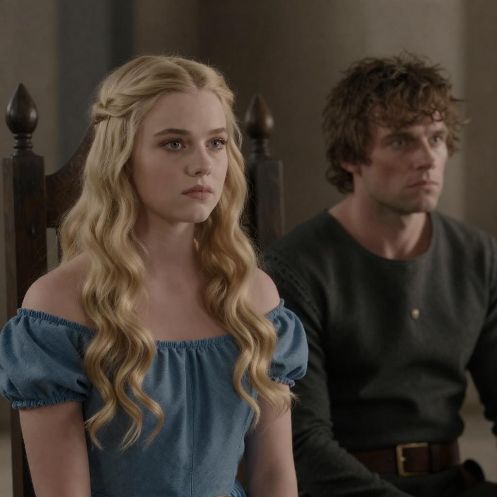 Photograph of a bearded man with gray hair and a blue beard, wearing a red and black medieval-style robe, holding a lit candle. A woman with long, wavy blonde hair in a pink dress stands behind him, her hand on his shoulder. Warm candlelight illuminates the background.