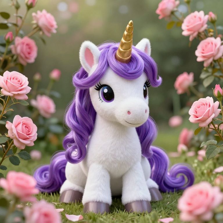 A whimsical scene where a baby unicorn with a golden horn and vibrant purple mane sits serenely amidst a dreamy garden of blooming pink roses, defying the boundaries of reality with its enchanting presence.