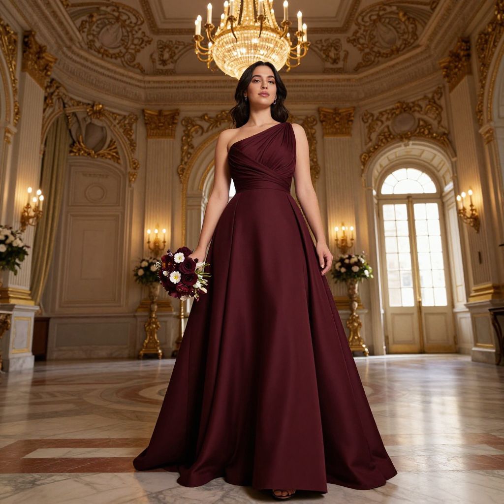 Photograph of a confident woman in a deep burgundy one-shoulder gown, holding a bouquet, standing in an opulent, ornately decorated