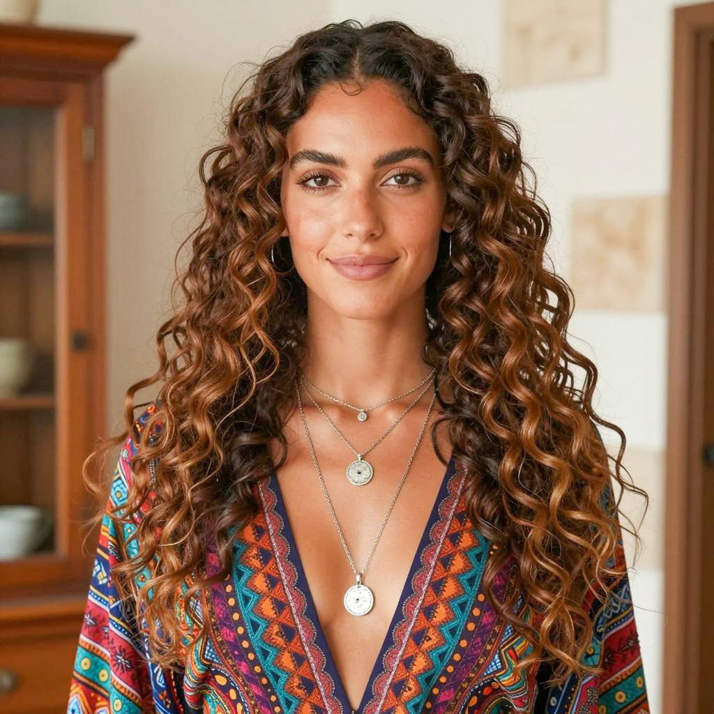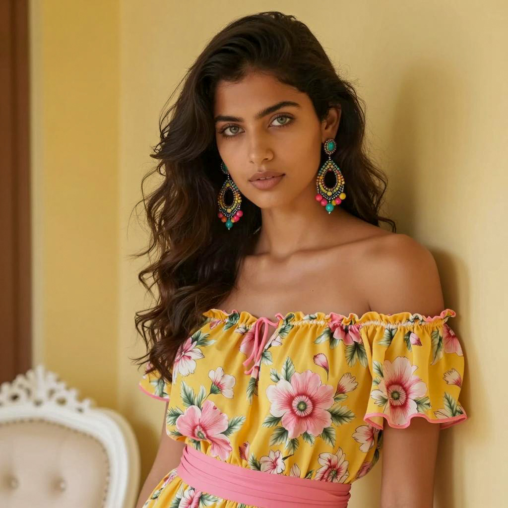 Photograph of a young woman with long, wavy dark brown hair. She wears a colorful, crocheted boho top with wide sleeves, yellow, purple, and blue patterns. Her pink bra is visible underneath. She has purple, tassel earrings and a gold necklace with a purple pendant. She stands against a yellow wall. Her expression is neutral. The image includes the "@DESIGNCOOLHQ" in the bottom right corner.