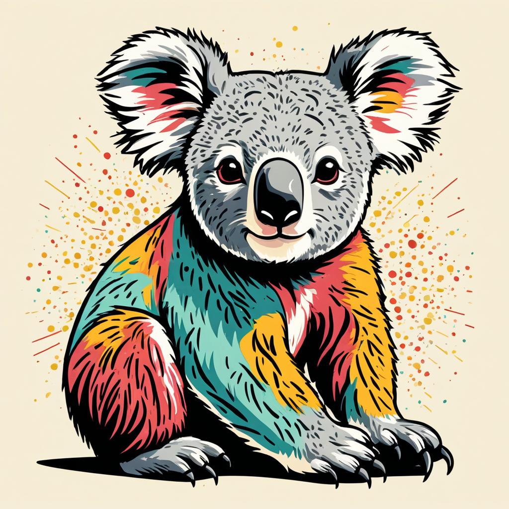 Cute and colorful vector illustration of a koala in bright colors on a cream background, using simple shapes and bold lines. No shading or gradients, suitable for screen printing. Vibrant hues with clear outlines for an eye-catching effect, designed for silkscreening, stamp-like gouache style.