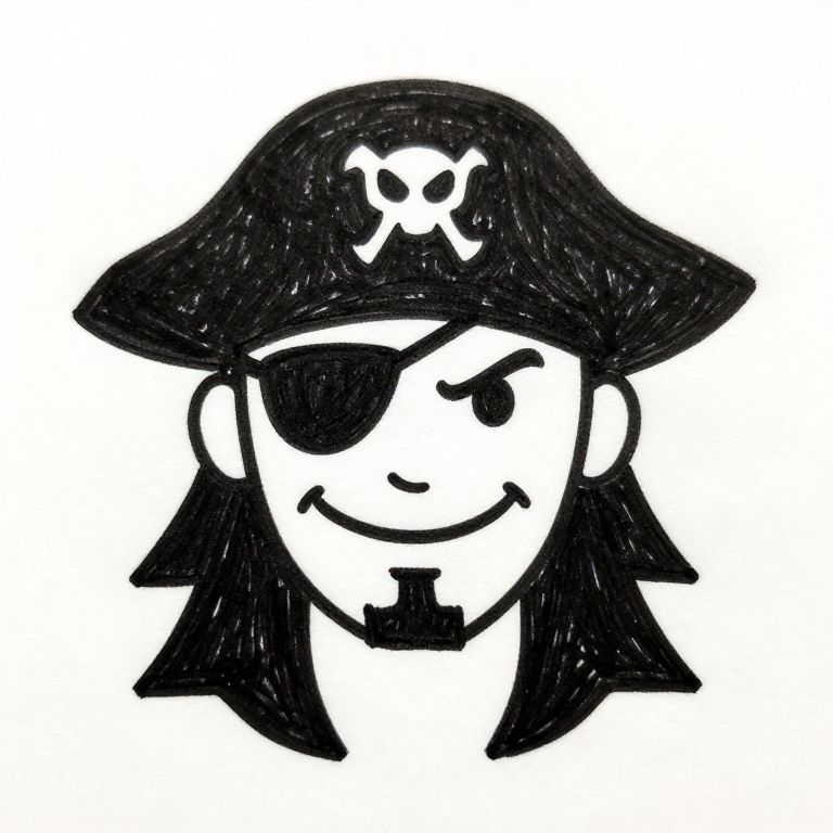 Easy beginner villain drawing depicting a villainous pirate with a simple eyepatch and a sly grin, bold lines with minimal details, set on a plain white background, crafted for aspiring artists to quickly capture villain traits.