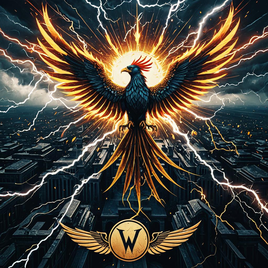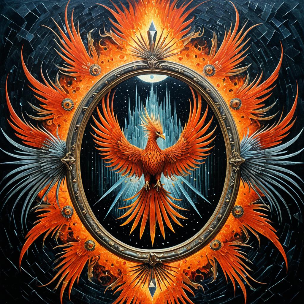 Art logo with phoenix and cherry blossoms, fantasy style, in the style of Jacek Yerka, aerial view, ethereal, rendered in 8K.