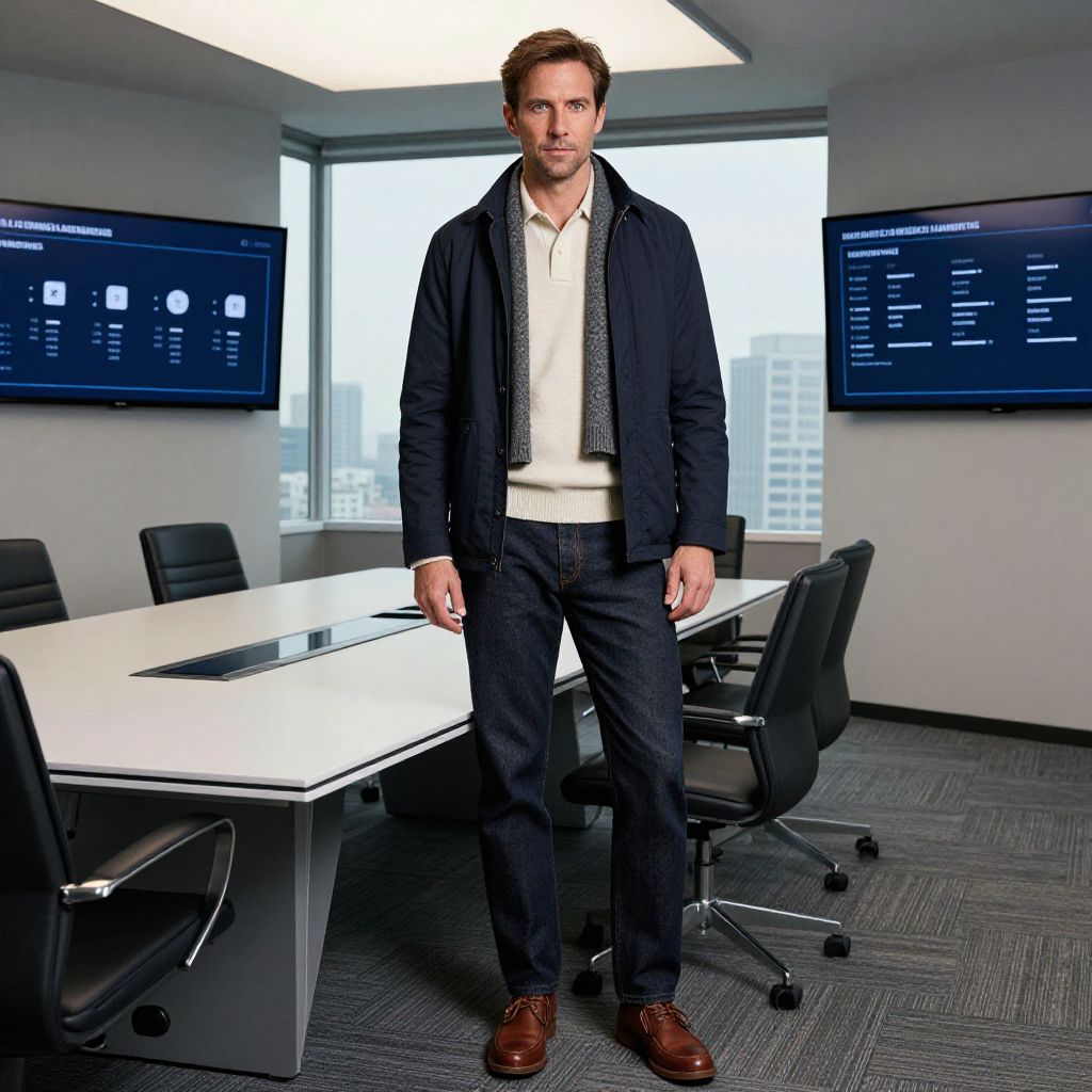 A man, Harrington jacket in navy, cream wool polo shirt, dark denim jeans, brown leather chukka boots, gray textured scarf, sleek conference room, digital displays on walls, panoramic city views, oversaturated film style, confident expression Man has masculine face and piercing eyes