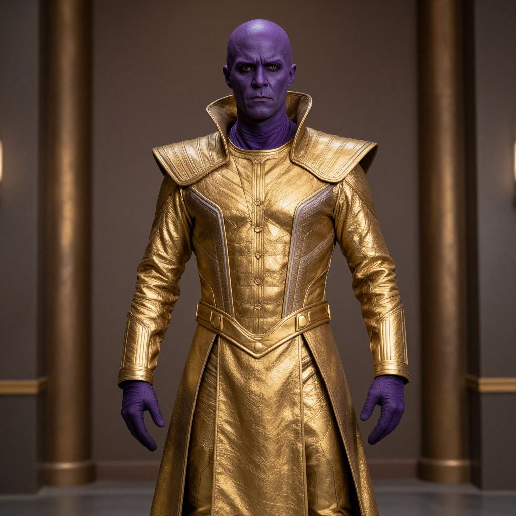 Digital rendering of a bald, purple-skinned man in a golden, high-collared coat with intricate details, standing in a dimly lit,