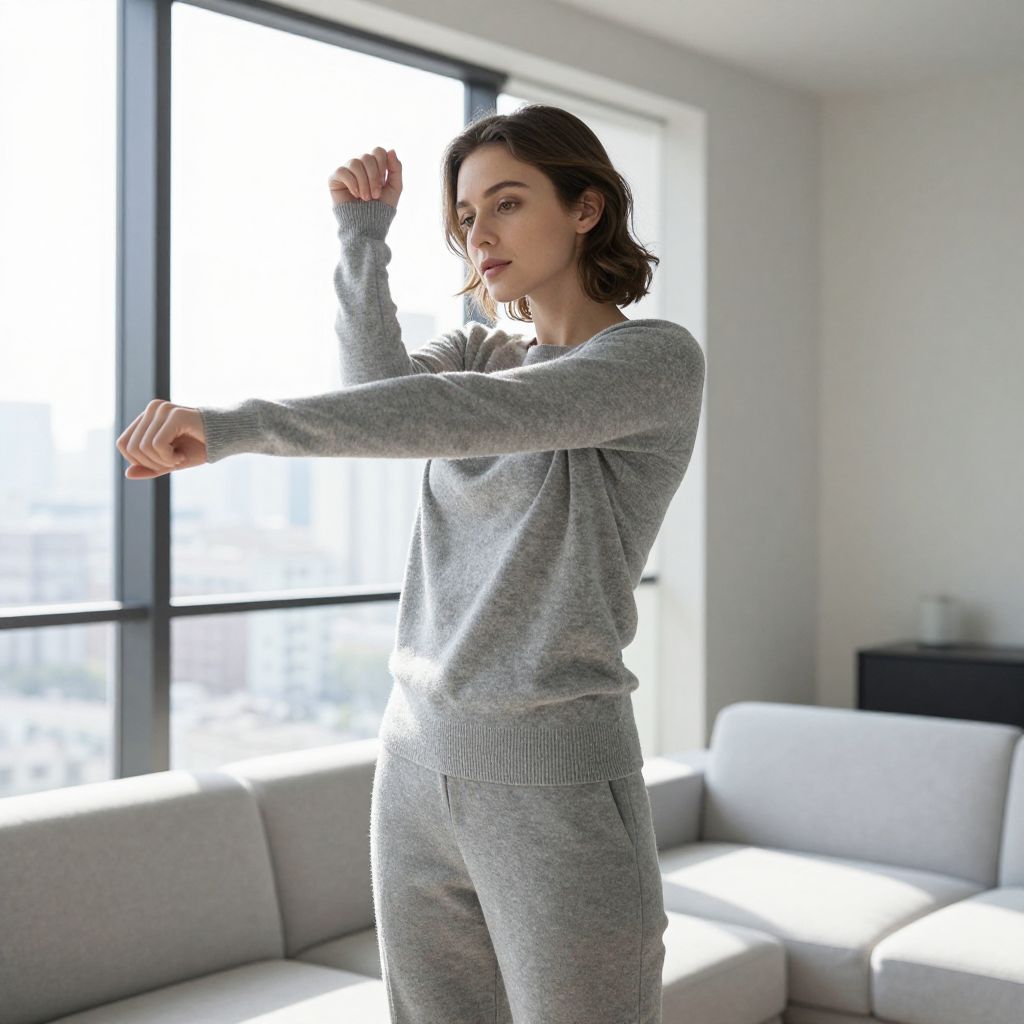 A minimalist apartment studio with warm indoor lighting, a slender woman in her early 20s with soft, straight brown hair and a gentle smile sits on a low stool by a window, wearing soft, rounded pink slippers with a subtle pastel gradient, one foot resting on an indoor plant, the space clean and airy with a calm, modern atmosphere.