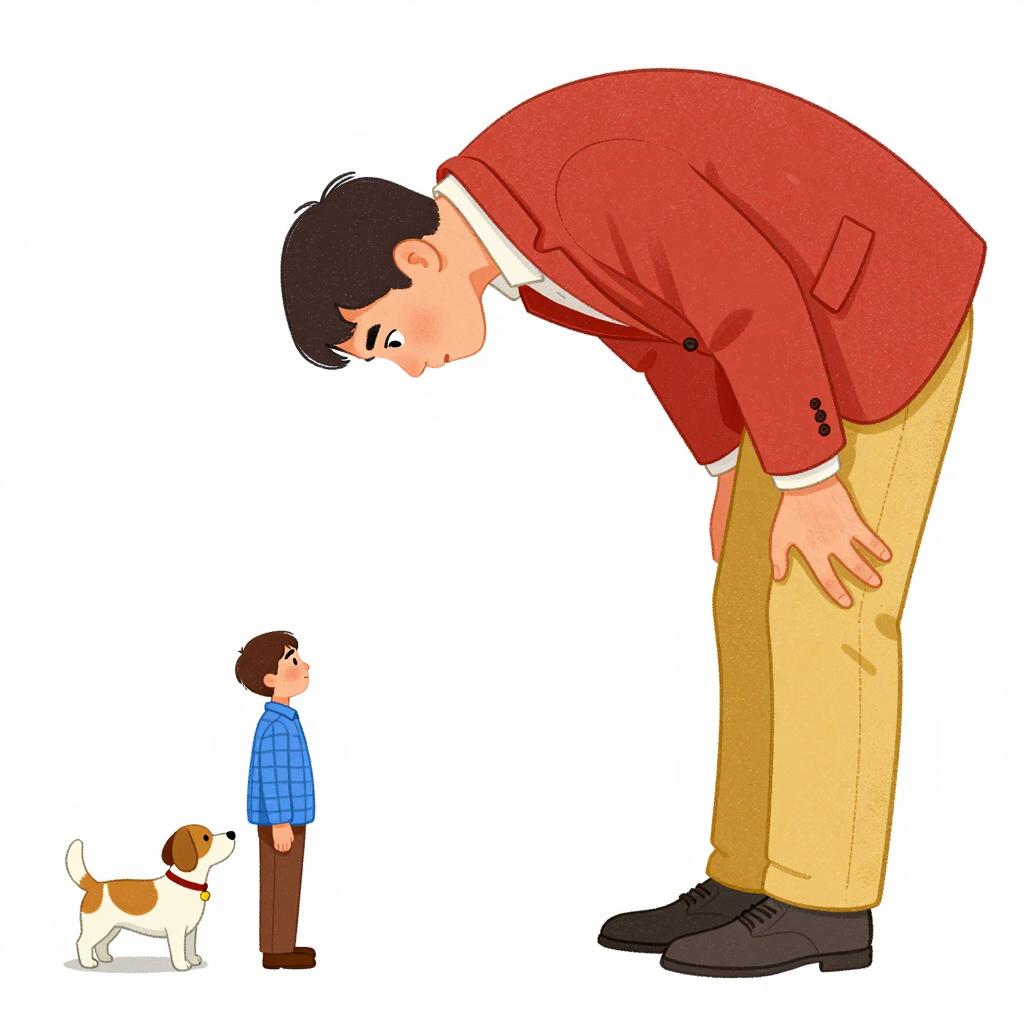 Illustration of a man in a red suit with long sleeves and yellow pants, bending over, head upside down, looking at a small man in a blue plaid shirt and brown pants standing next to a small brown and white dog. White background. The large man's face is visible, with intense eyes. The small man looks at the dog. The dog looks up.
