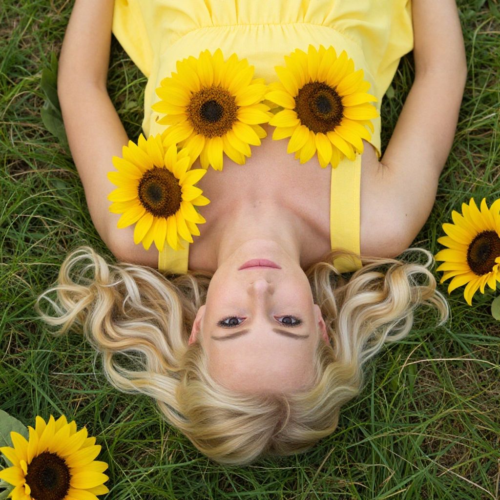 Realistic adult girl with blonde wavy blonde/platinum hair until waist, frontal shot, (high perspective:1.10) yellow sundress, grass (female head focus, female head lying on the grass:1.10), (carefree and sad face:1.05) girl of the sunflowers (wears a yellow sundress made of big sunflower:1.05), (upper body illustration). strangecomposition