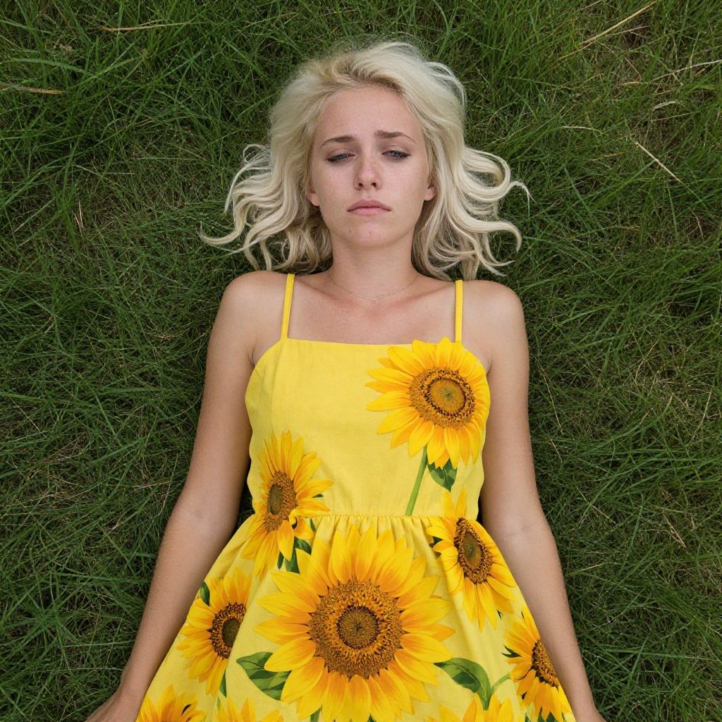 Photograph of a young white woman with wavy platinum blonde hair lying on lush green grass. She wears a bright yellow sundress adorned with large sunflower prints. Her expression is neutral, with slightly parted lips and downcast eyes. The sundress has thin straps and a gathered waist, emphasizing her slim physique. The vivid yellow dress contrasts sharply with the dark green grass, creating a striking visual. The image focuses on her upper body and face, with the grass filling the background. The lighting is natural, highlighting the textures and colors.