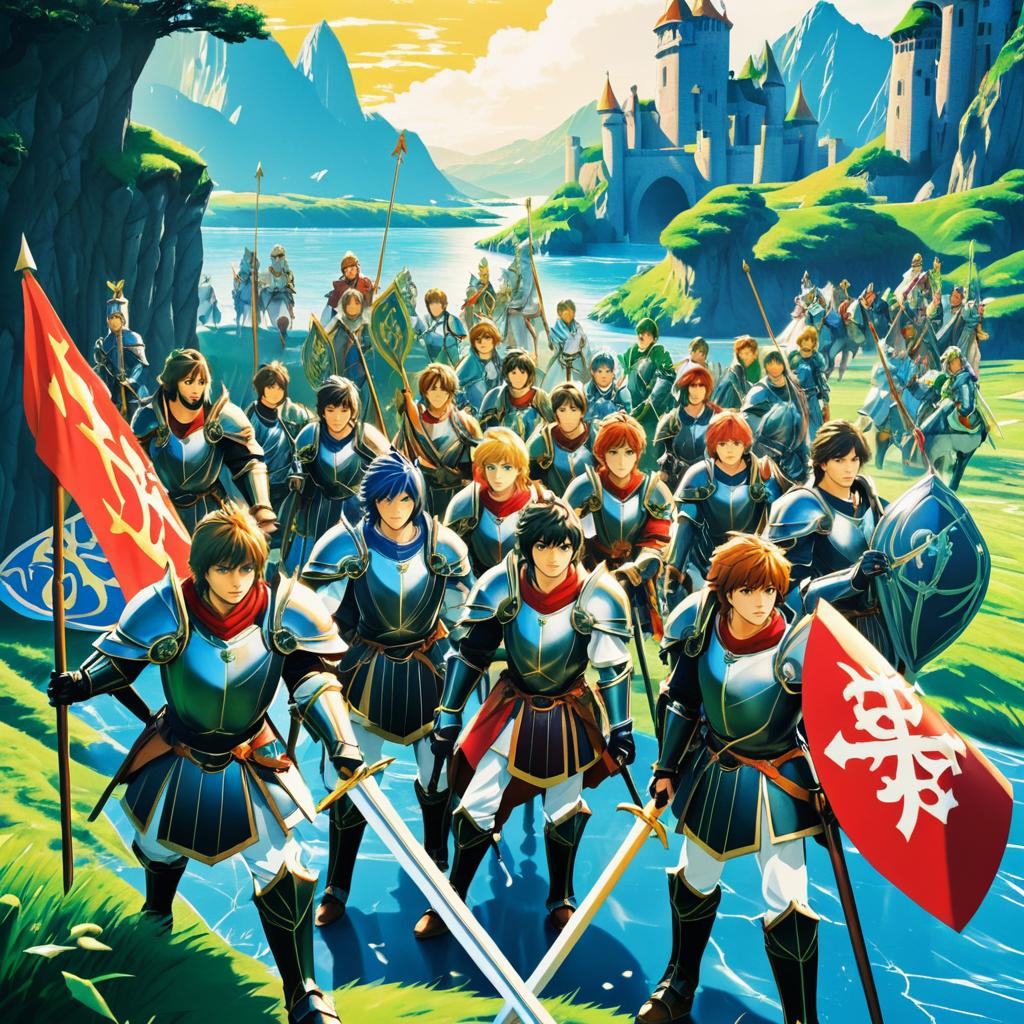 A group of heroic knights in shining armor with swords and shields are depicted in anime style standing on a grassy field. The scene features vibrant colors and detailed armor design, with a majestic castle in the background surrounded by mountains and lush green trees.