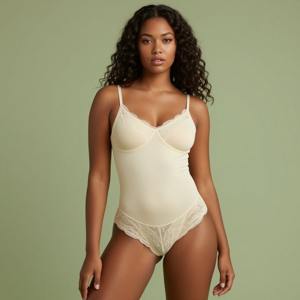 Photograph of a confident Black woman with dark, curly hair, standing against a plain, light green background. She wears a white, lace-trimmed, one-piece lingerie bodysuit with thin straps and a deep V-neckline, emphasizing her medium-sized breasts and toned physique. Her skin is smooth and dark brown, and she gazes directly at the camera with a neutral expression. The lighting is soft, highlighting her natural beauty and the delicate texture of the lace. Her arms are relaxed by her sides, and her posture is straight and poised.