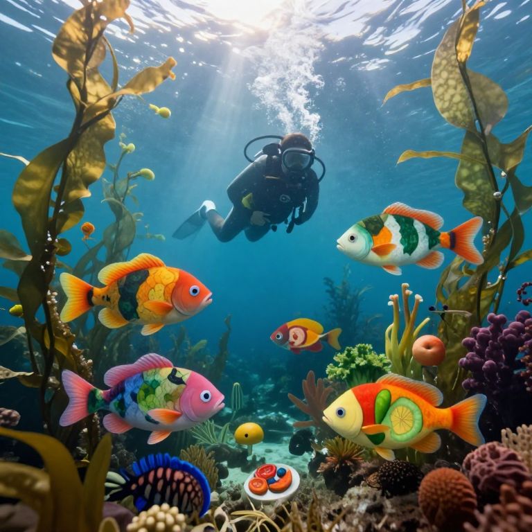 Envision an underwater landscape reminiscent of Giuseppe Arcimboldo's dreamy masterpieces, where fish metamorphose into abstract representations of fruits and vegetables. From the diver's vantage point, these aquatic creatures transform into a mesmerizing still life beneath the surface, merging nature and artistry in an enchanting tableau. The gentle sunlight filtering through the kelp enhances the scene's serene atmosphere, while the kaleidoscope of colors sparks curiosity and admiration for the hidden world below.