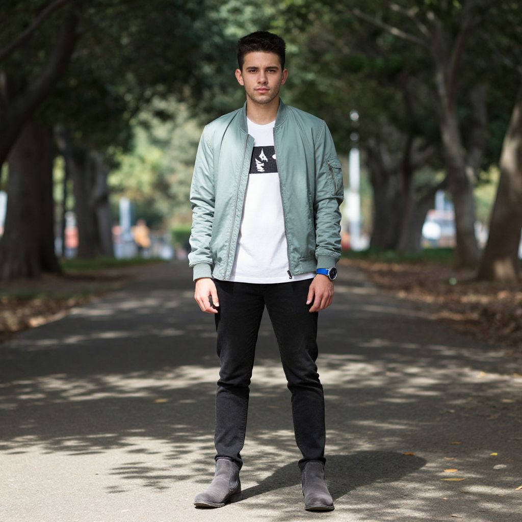 Photograph of a young man standing under a tree with dappled sunlight filtering through. He has short dark hair, light skin, and a clean-shaven face. He's wearing a light green bomber jacket over a white t-shirt with a black graphic, black slim-fit jeans, and gray ankle boots. A blue watch is visible on his left wrist. The background is a shadowy, tree-lined path.