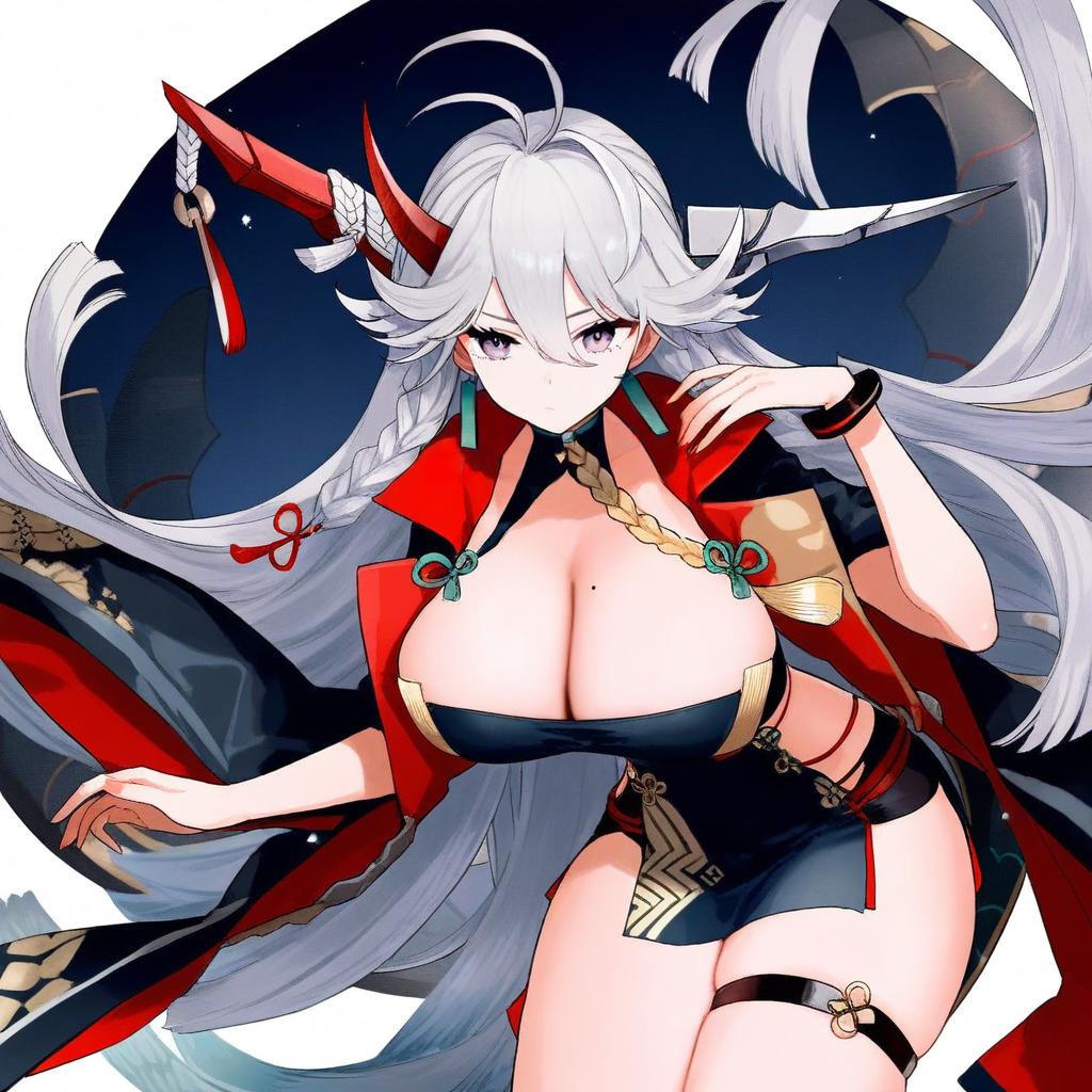 Hakuryuu (azur lane), azur lane, 1girl, asymmetrical horns, mismatched horns, red horns, white horns, hair on horn, multiple horns, hair between eyes, grey eyes, white hair, long hair, grey hair, very long hair, large breasts, huge breasts, mole on breast, cleavage, thigh strap, skindentation, earrings, by artist l hakase, animagine