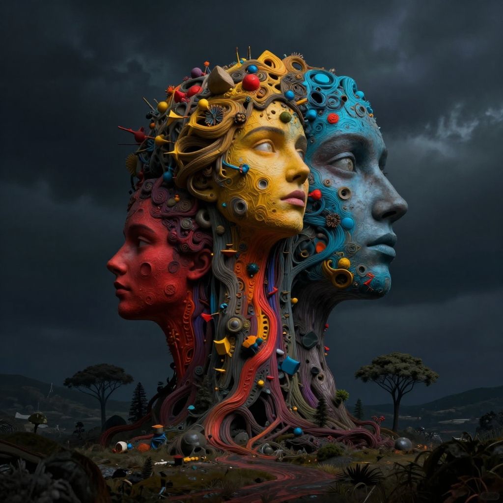 Surreal CGI artwork of three colorful, intricately detailed, humanoid heads with mechanical and organic elements, set against a dark, cloudy sky.