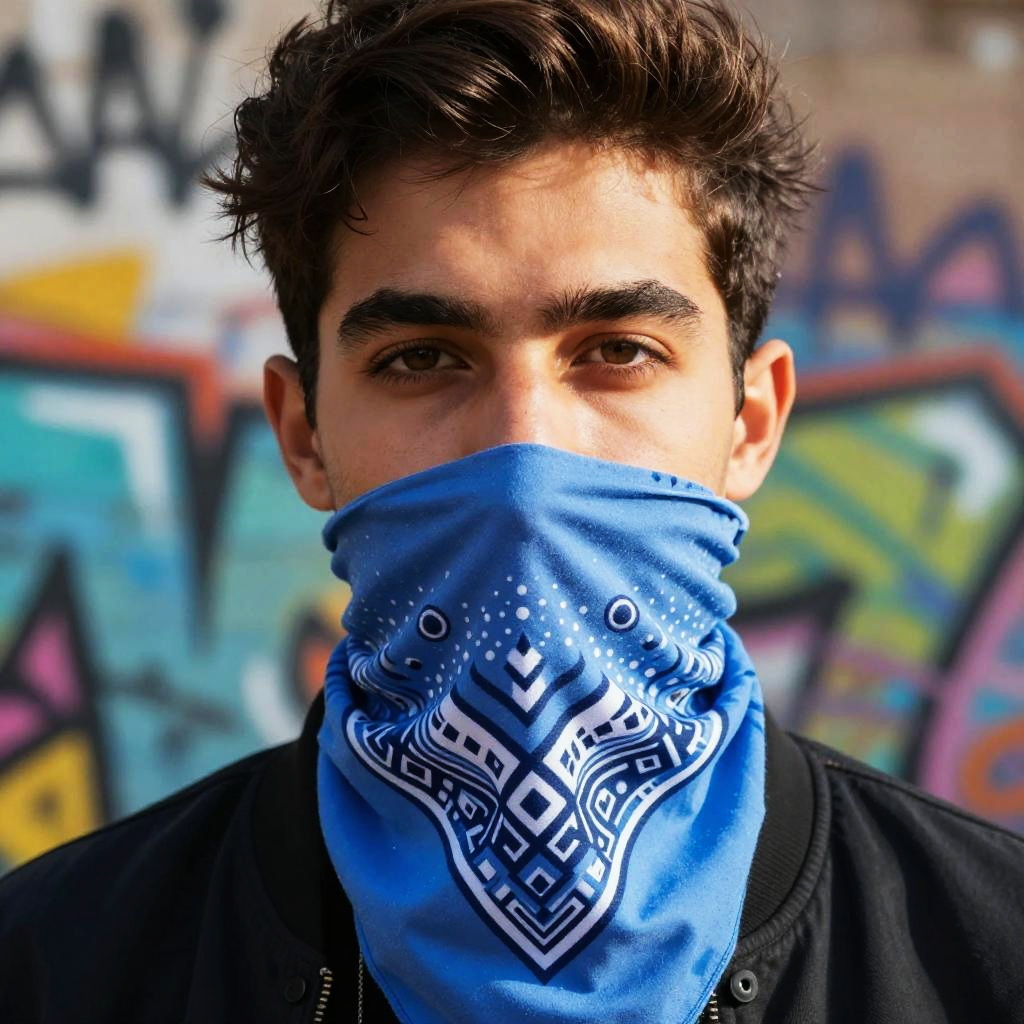 Bandana covering mouth, vibrant street style portrait, urban graffiti backdrop, high contrast lighting, detailed fabric texture, expressive eyes, cinematic color grading