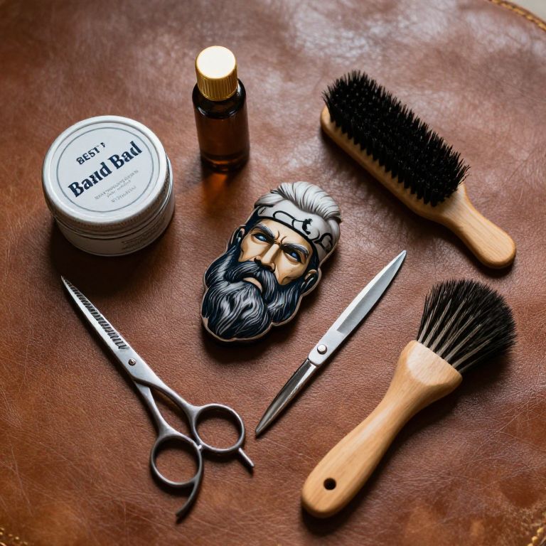 A flat lay of the best beard tools with various grooming essentials such as beard balm, oils, scissors, and brushes, placed on a vintage leather surface with soft shadows and warm tones, capturing a professional beard care kit aesthetic.