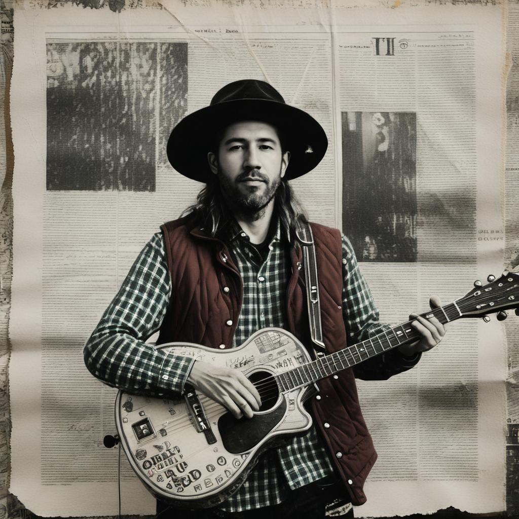 Mixed media artwork + (scratchy faded torn up newspaper overlay:2.0), insightful musician, wearing bohemian vest and hat, in the style of symbolism, grainy fuzzy distorted canvas effect, muted burgundy, faded weathered effect color scheme, dreamlike atmosphere, abstract and distorted forms, soft glow overlay.
