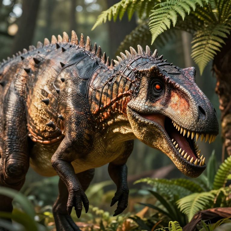 Photorealistic CGI image of a ferocious, detailed dinosaur in a dense, sunlit forest. The dinosaur has textured, scaly skin with a mix of dark green, brown, and orange hues, and prominent, sharp spikes along its back and head. Its mouth is open, revealing large, menacing teeth. Bright, glowing red eyes contrast with its dark skin. Surrounding the dinosaur are lush, green ferns and blurred tree trunks, creating a sense of depth and natural habitat. The lighting highlights the dinosaur's textured skin, adding a realistic, three-dimensional effect to the image.