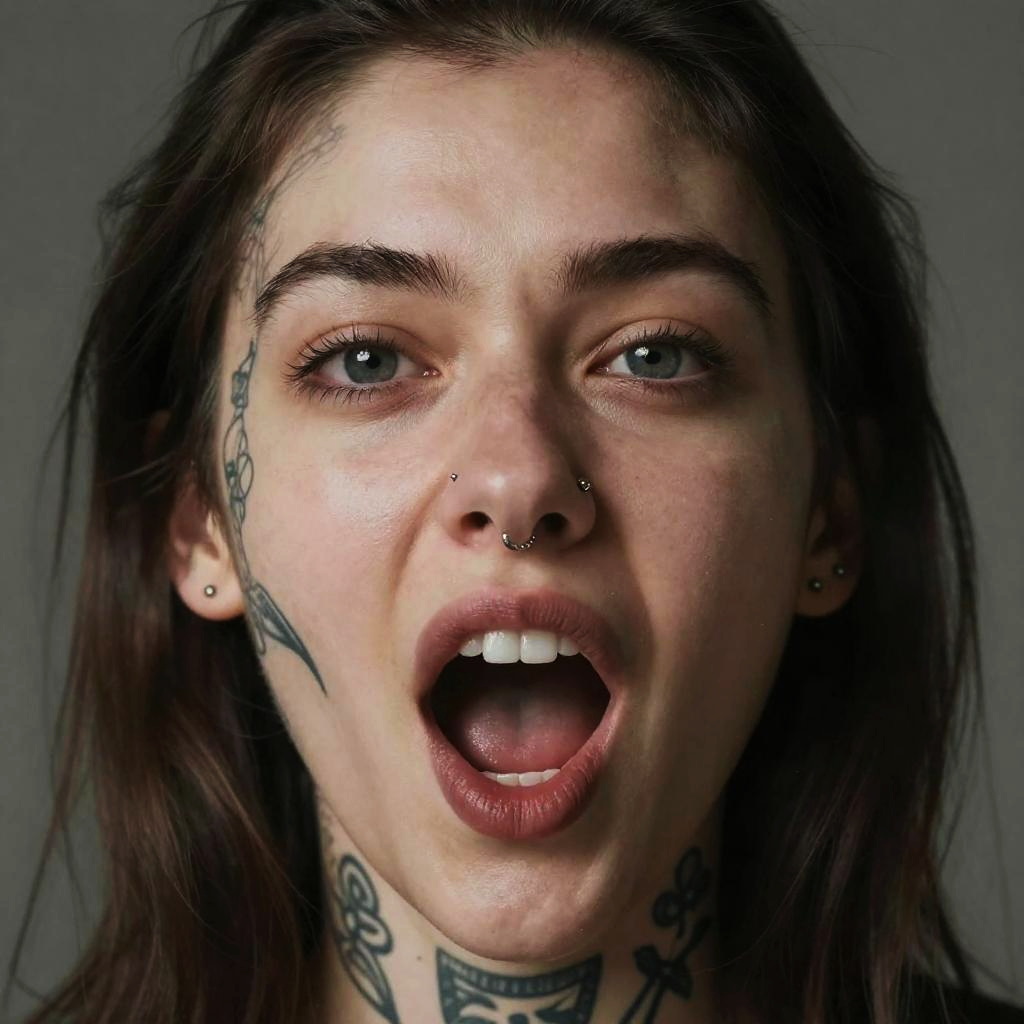 Photograph of a young woman with fair skin, dark brown hair, and blue eyes, looking directly at the camera with her mouth open in a surprised or shouting expression. She has a nose ring in her left nostril, a small piercing above her upper lip, and several tattoos: a black design on her right cheek, a tattoo on her left ear, and intricate tattoos on her neck. Her eyebrows are dark and slightly arched. The background is a simple, solid gray, keeping the focus on her expressive face. The lighting is even, highlighting her facial features and tattoos.