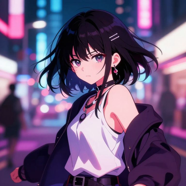 Anime-style digital artwork of a black-haired girl with purple eyes, wearing a white tank top, black jacket, and necklace, standing in a neon-l