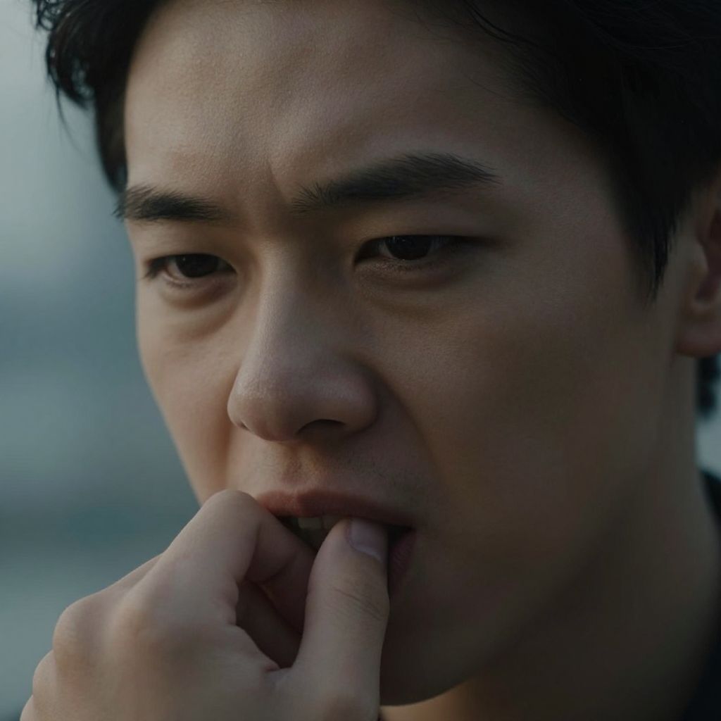 Close-up photograph of an East Asian man with short black hair, dark eyebrows, and serious expression, biting his index finger. Background is blurred and dim