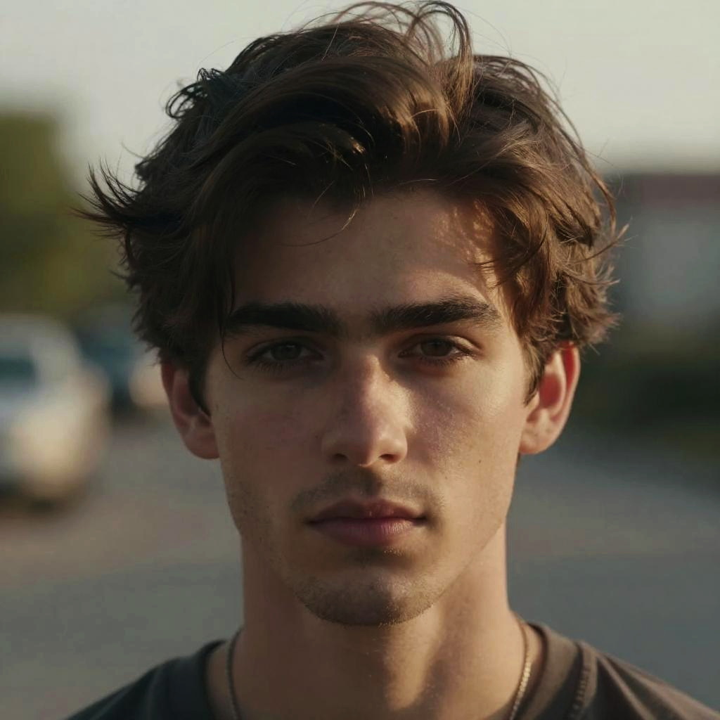 Sigma male photo close-up, intense gaze, slightly unshaven face, windswept hair, soft natural side-lighting highlighting strong features, muted background with bokeh effect, evokes independence and self-reliance, high resolution