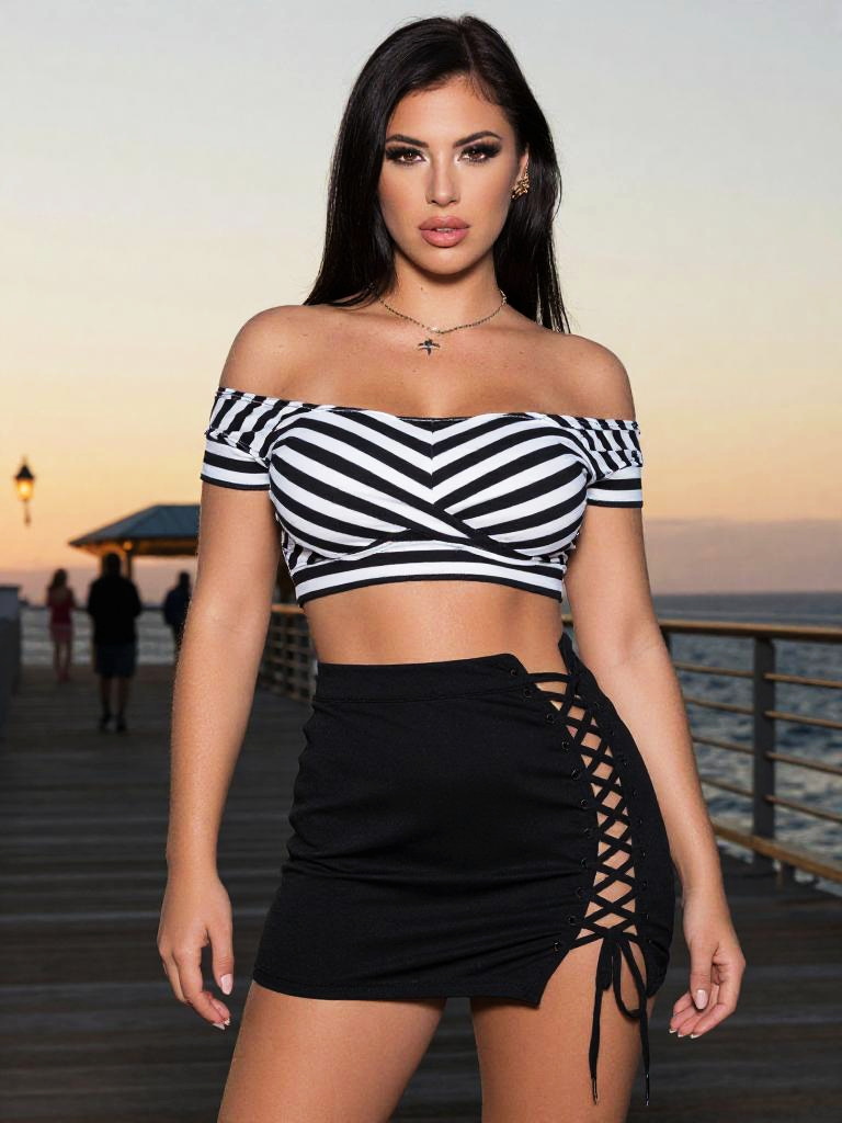 Photograph of a young woman with long black hair standing confidently on a beach boardwalk. She has a light olive skin tone and an athletic build. She wears a white cropped tank top that reveals her midriff, an olive green bomber jacket that hangs off her shoulders, a blue denim mini-skirt, black ankle socks, and white high-top sneakers. The background features a sandy beach with colorful buildings and people in the distance. The boardwalk is gray and smooth. The overall style is casual and streetwear-inspired. The image has a slight blur effect, emphasizing the subject.