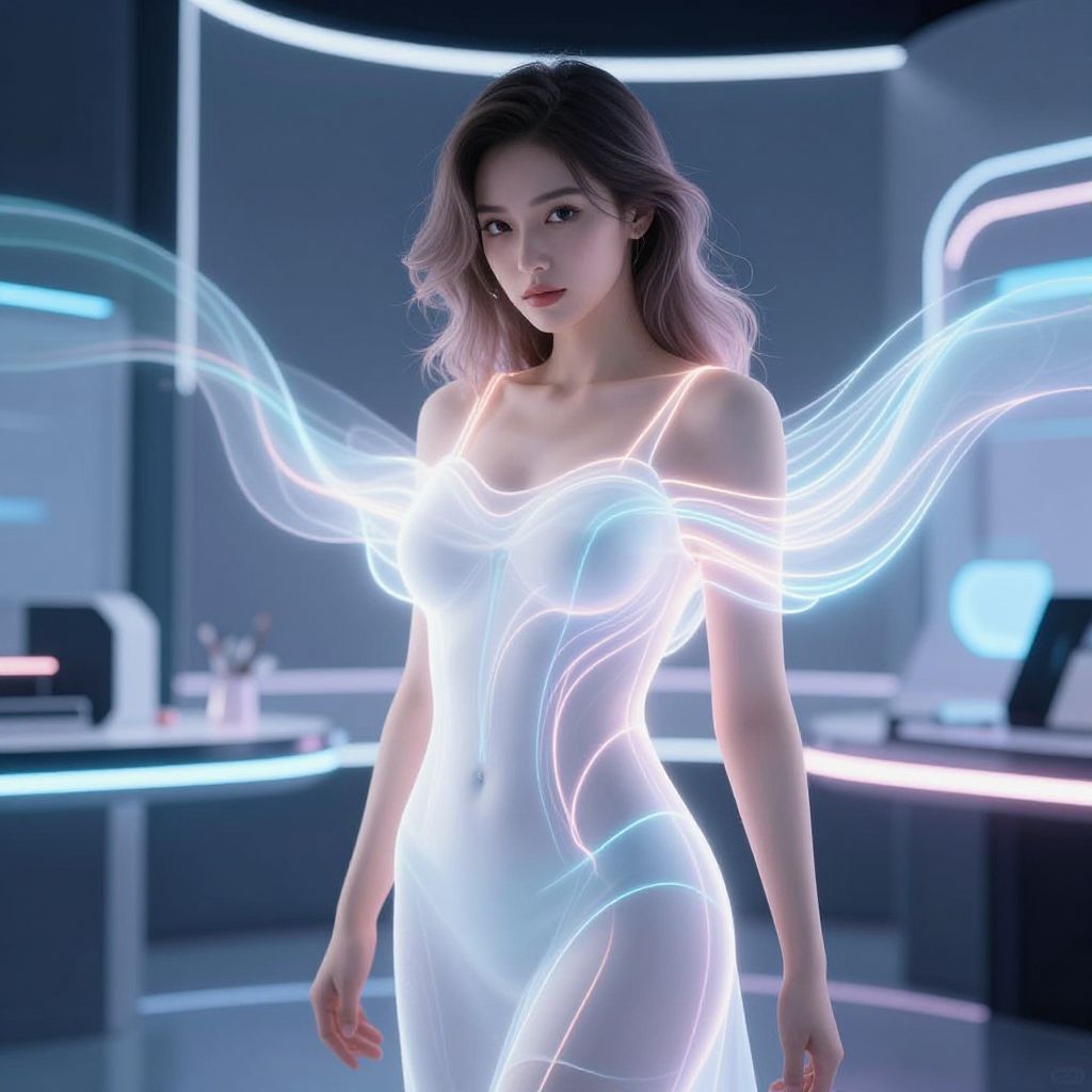 Sexy ai prompt: A futuristic digital artist generating elegant, ethereal visuals with glowing neon lines and soft bioluminescent hues, blending AI-driven creativity with a sensual yet artistic aesthetic in a sleek, high-tech studio environment.