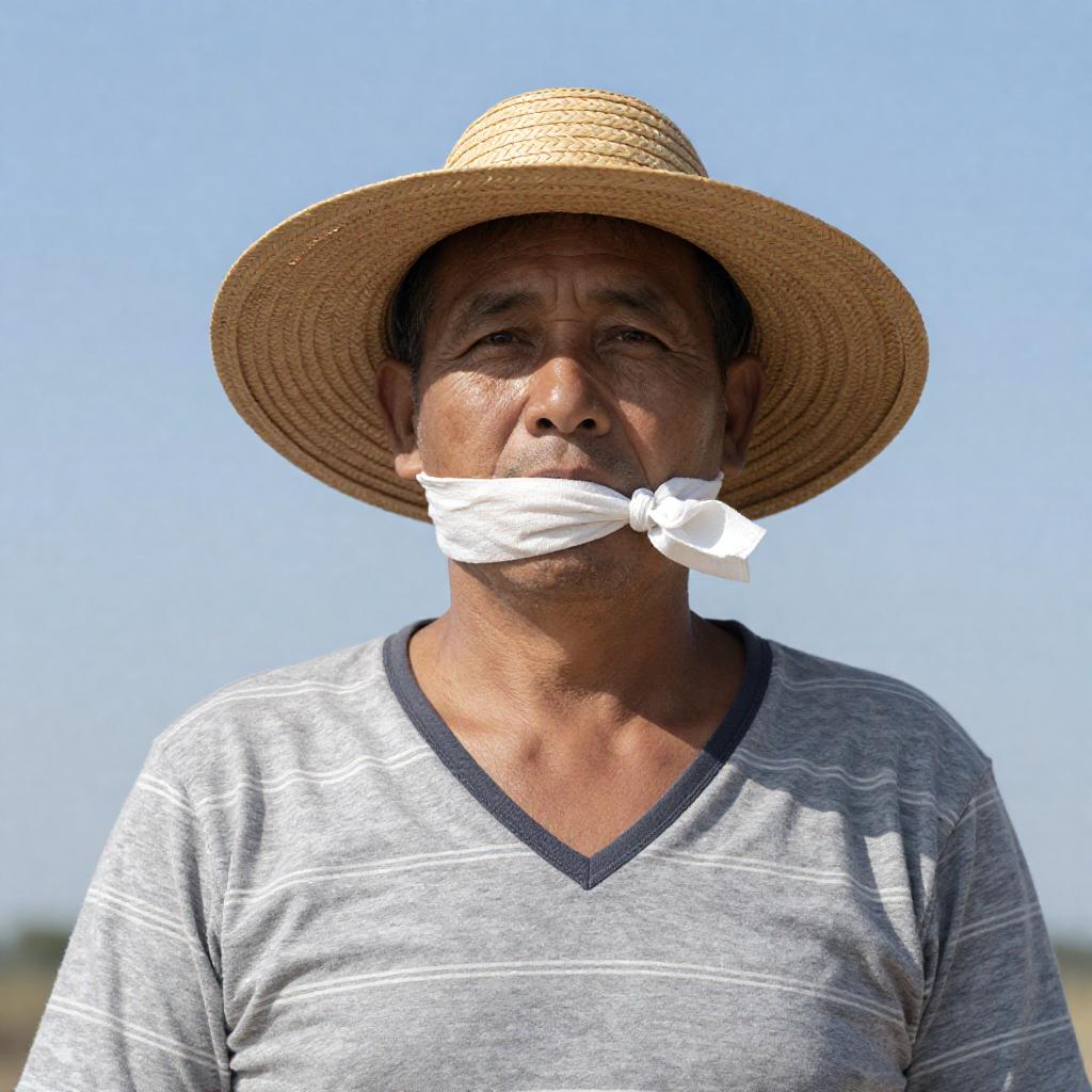 Asian man with medium skin tone, wearing a large woven hat and a gray, ured shirt. His face is serious and turned to the side. Background includes a dark wooden structure and a red umbrella. Sunlight highlights his face and hat.