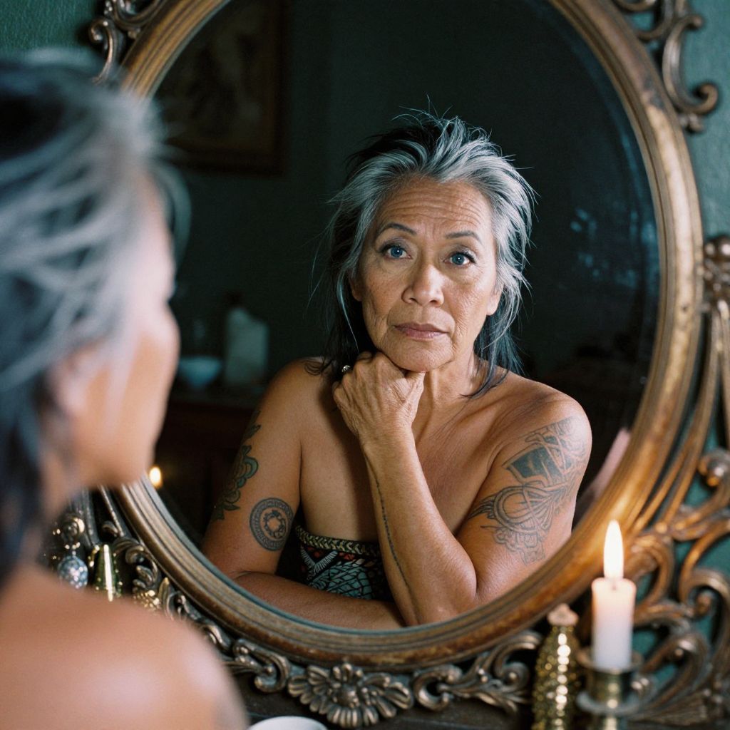 Photograph of an elderly Asian woman with gray, slightly disheveled hair, reflected in an ornate, oval mirror. She has tattoos on her right shoulder and upper arm, and is wearing a black, strapless top. Her expression is serious, with one hand resting on her chin. The background is dark, with a candleholder with a lit candle on the right, adding a warm glow. The mirror has an intricate, vintage frame, and the image is focused on her face and upper body, capturing the depth of her contemplative look.