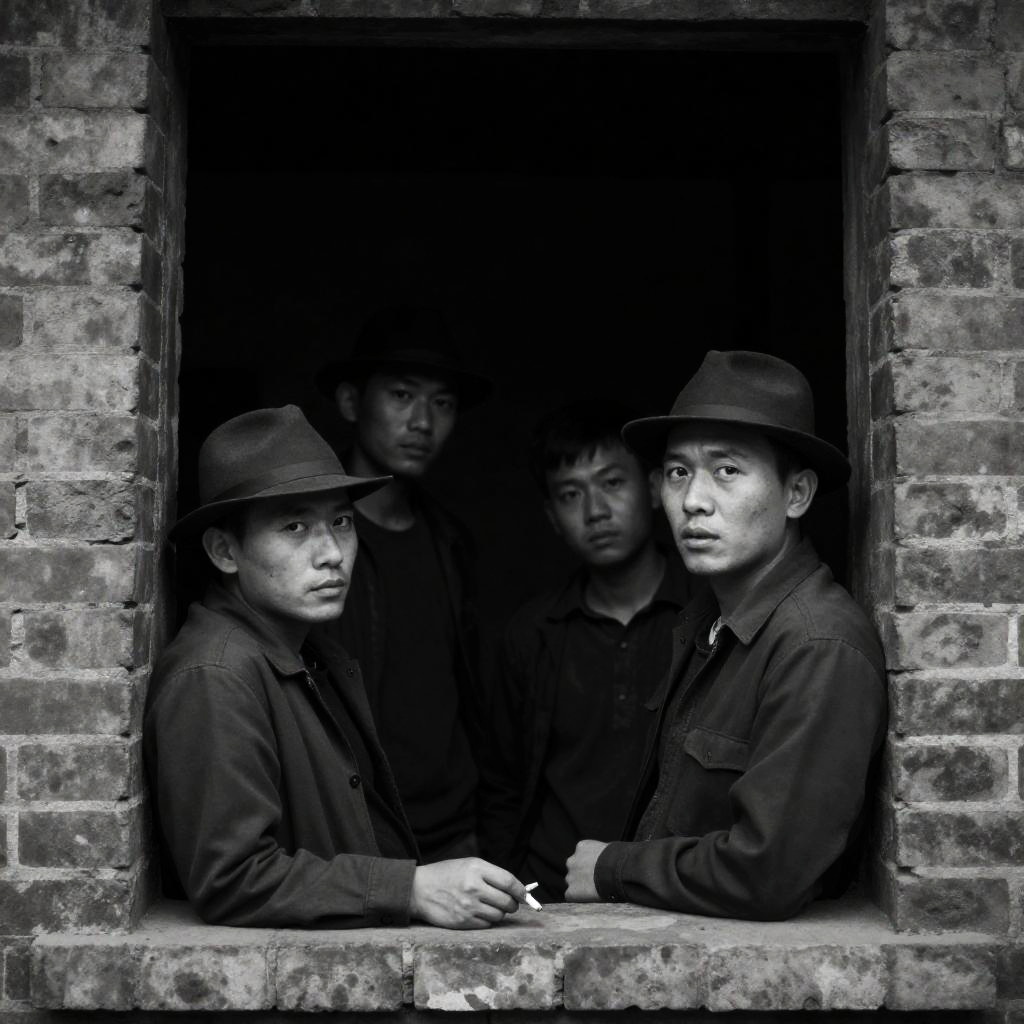 Black-and-white photograph of two Asian men. Both have medium skin tones, mustaches, and wear head coverings. The man on the left wears a towel on his head, looking upwards. The man on the right wears a cap, looking to the side. Background is a ured brick wall. Both have intense, curious expressions.