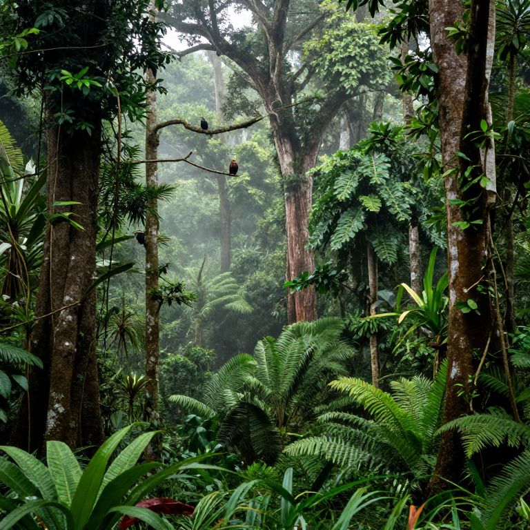 Oceania lush rainforest landscape, dense greenery with ancient towering trees, exotic birds perched on branches, mist rising from the jungle floor, diverse flora and fauna, rich textures and natural lighting, immersive and detailed