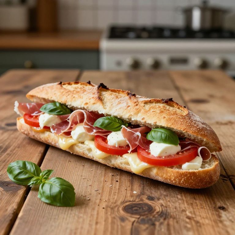Panuozzo Italian sandwich on rustic wooden table, freshly baked elongated bread stuffed with melted mozzarella, fresh tomatoes, basil leaves, and cured ham, rustic Italian kitchen background, warm natural lighting, high detail food photography style