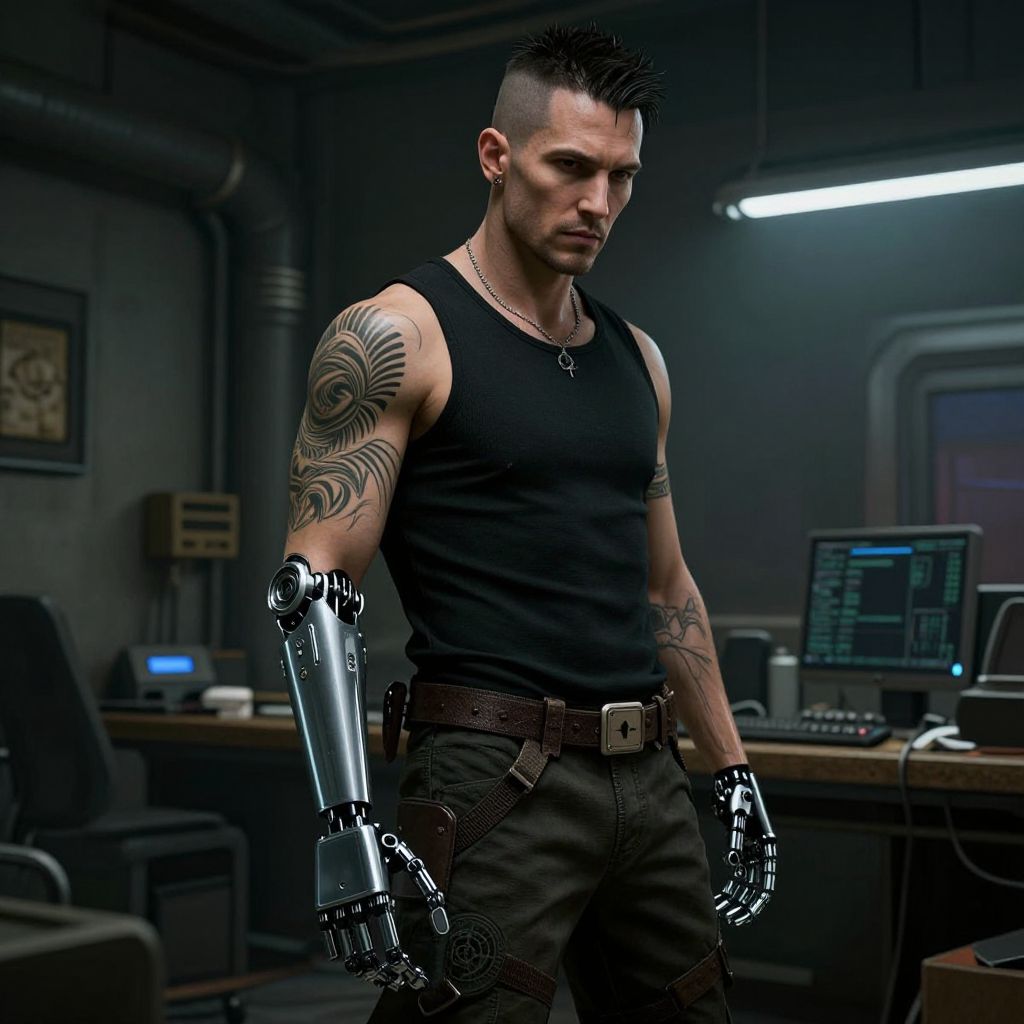 A cyberpunk low-life man with a tattooed arm and a mechanical prosthetic stands in a dimly lit, cluttered room.