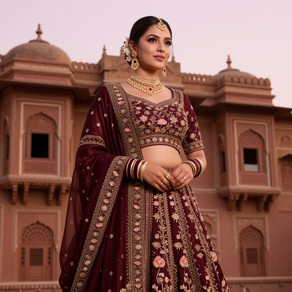 A beautiful South Asian model in a rich maroon lehenga with floral motifs and hand-stitched gold work, dressed in an elegant engagement costume; her face has soft curves, warm brown eyes, and a joyful, confident look; posed against a vintage haveli backdrop with ornate windows and a pink-tinted sky, capturing the essence of Indian wedding culture.