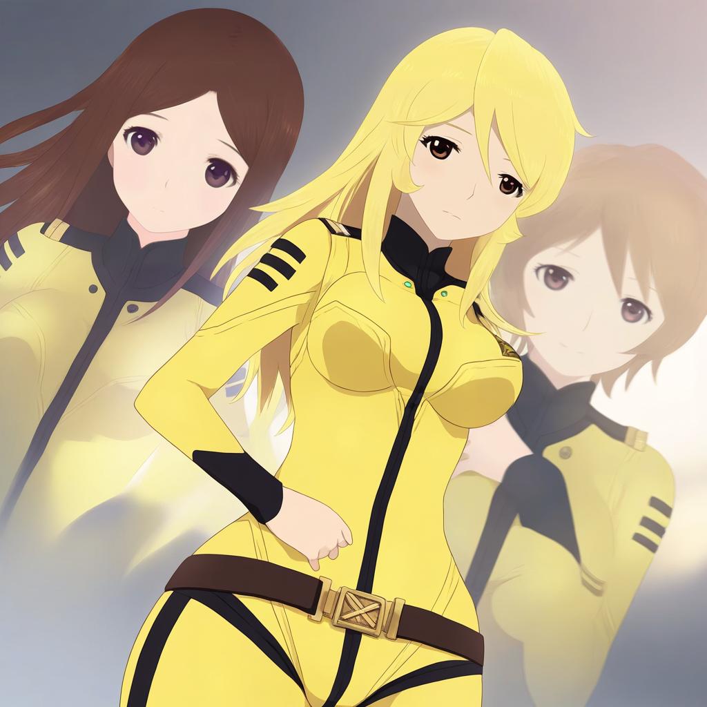 Digital illustration of three female anime characters wearing yellow bodysuits with black accents. The central figure has long blonde hair, brown eyes, and a confident pose with her hand on her hip. The two background characters have long brown hair and purple or brown eyes, blending softly into the scene. The style is influenced by sci-fi and space themes, inspired by the series Uchuu Senkan Yamato.