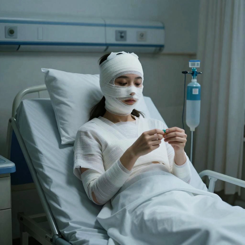Woman with bandages covering head, chest, and arms, holding small object, sitting in hospital bed with metal frame, white pillows, oxygen tank, and privacy curtain in background. Hospital setting, dim lighting, visible medical supplies, bandages over face.